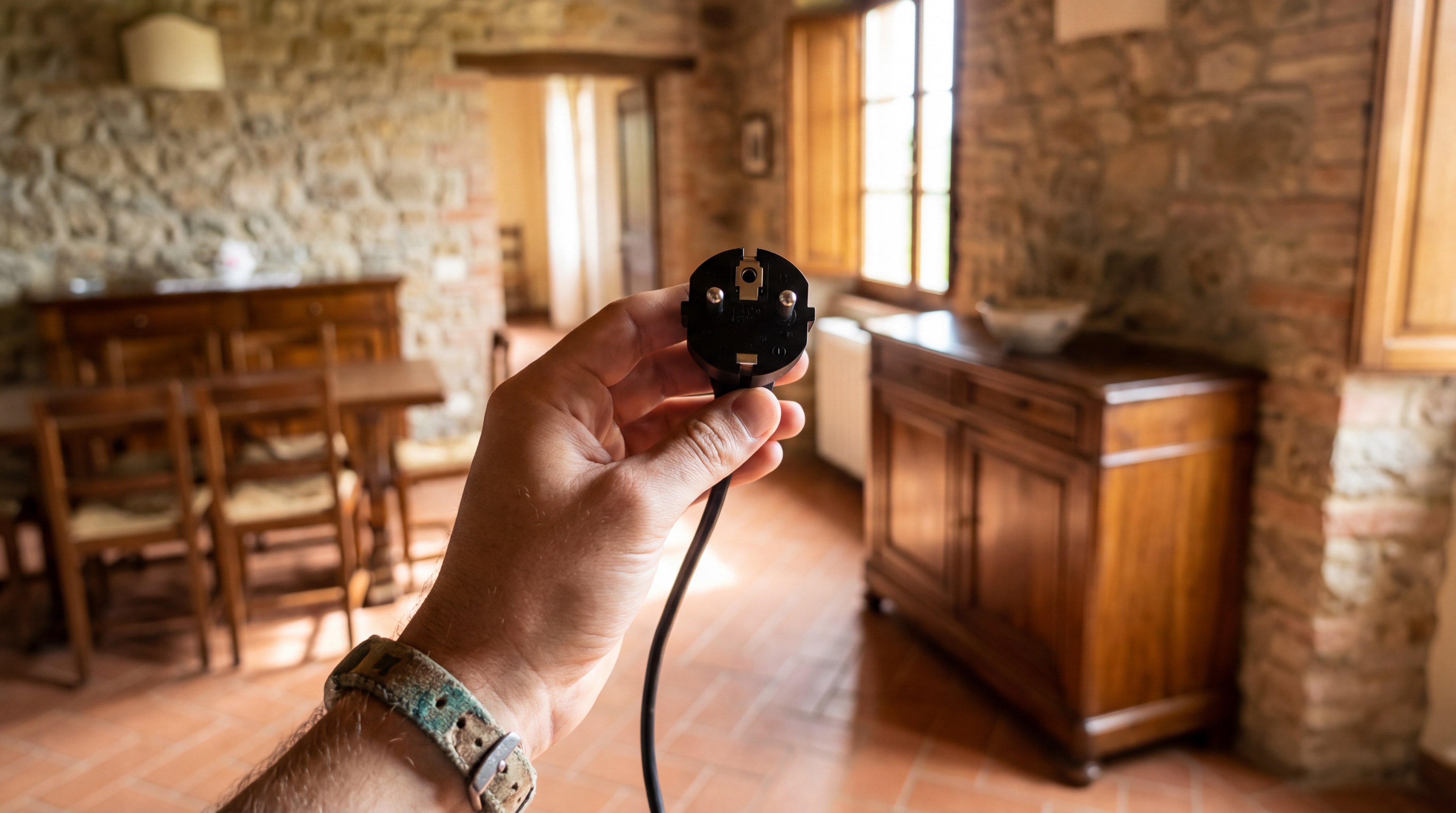 Historic Tuscan properties often feature a mix of electrical standards updated incrementally. You may find narrow Type L sockets in one room and wide Schuko Type F outlets in another.