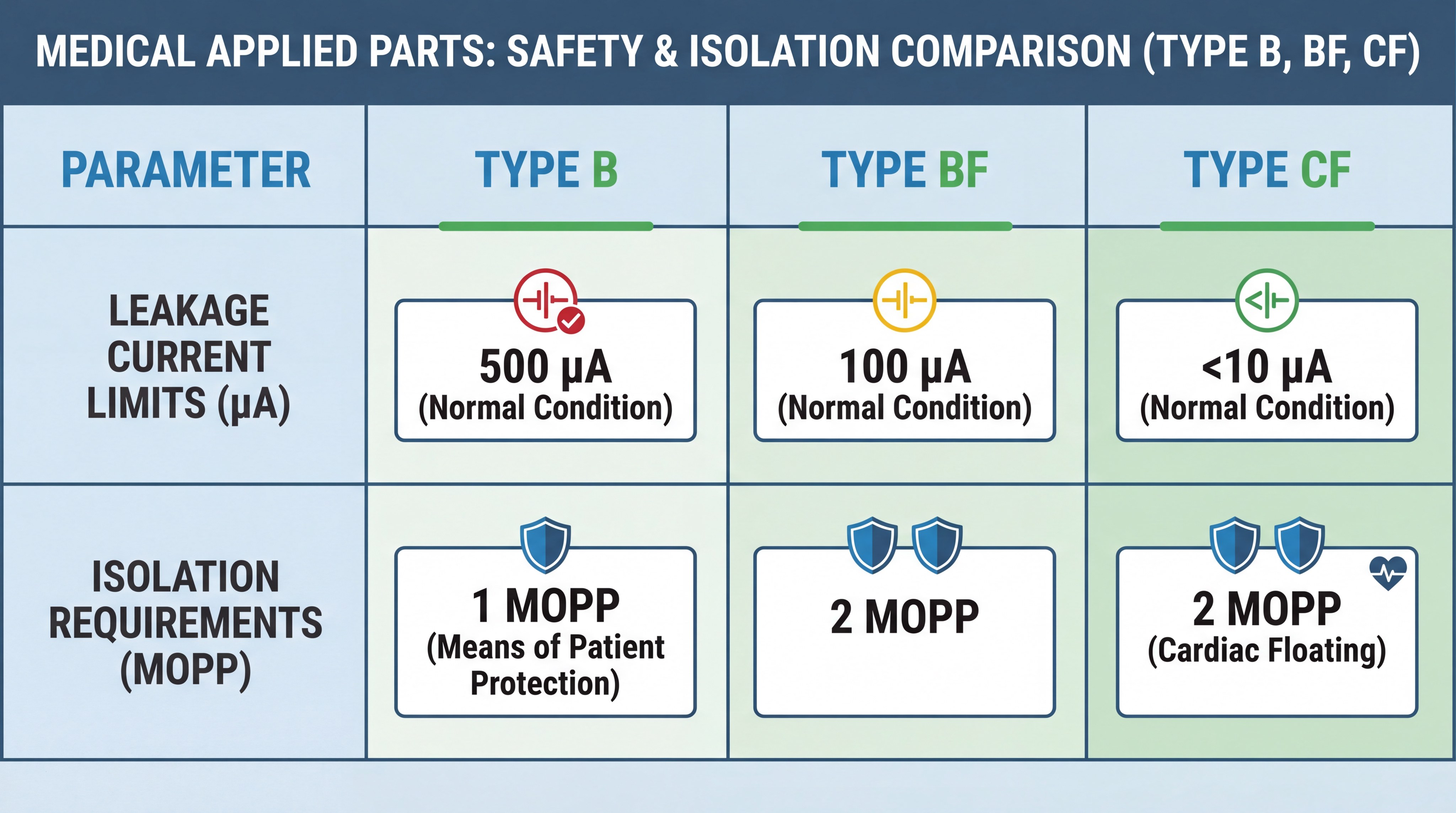 Cardiac Floating (CF) ratings are the strictest of all, required for devices making direct contact with the heart. These demand ultra-low leakage levels that go beyond standard BF requirements. Most general medical devices will fall under the BF category.